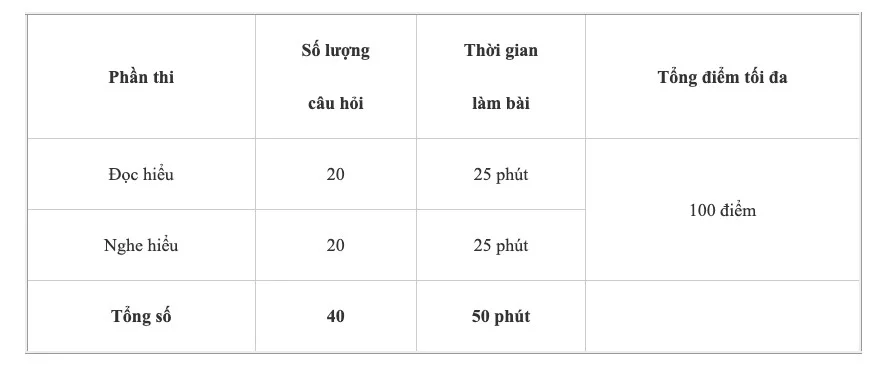 – (1) Câu hỏi thi theo hình thức trắc nghiệm, (2) Phần thi đọc và thi nghe được tiến hành liên tục không có nghỉ giải lao.